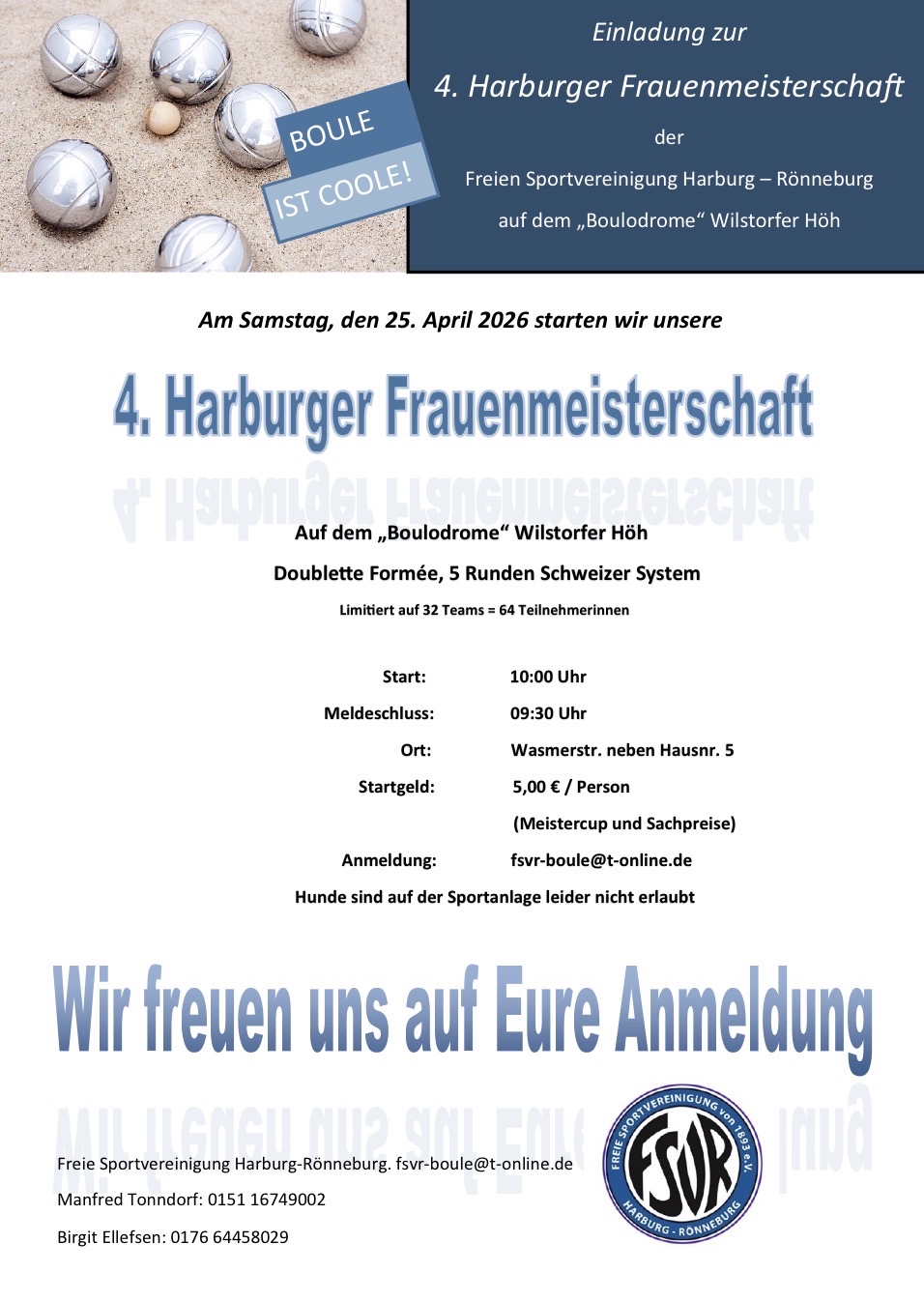 Ein Turnier für Sechser-Teams organisiert die SG Findorff am SO 12.07. Die Teams messen sich in jeweils drei Doublette-Partien, davon zwei als Mixte. Die Online-Anmeldung » wird am 1. März freigeschaltet; Mehr » – „SixPacks“ waren eine beliebte Spielform in der Erlter Boule-Scheune. (07.01.)