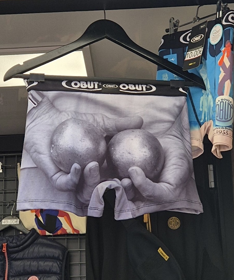 Die nervige Frage nach den noch zu spielenden Kugeln kann neuerdings mit einer Körperdrehung beantwortet werden: „Noch zwei, sieht man doch!“ – Käuflich zu erwerben ist das informative Höschen am Obut-Stand bei der Frauen-WM in Sin-le-Noble.