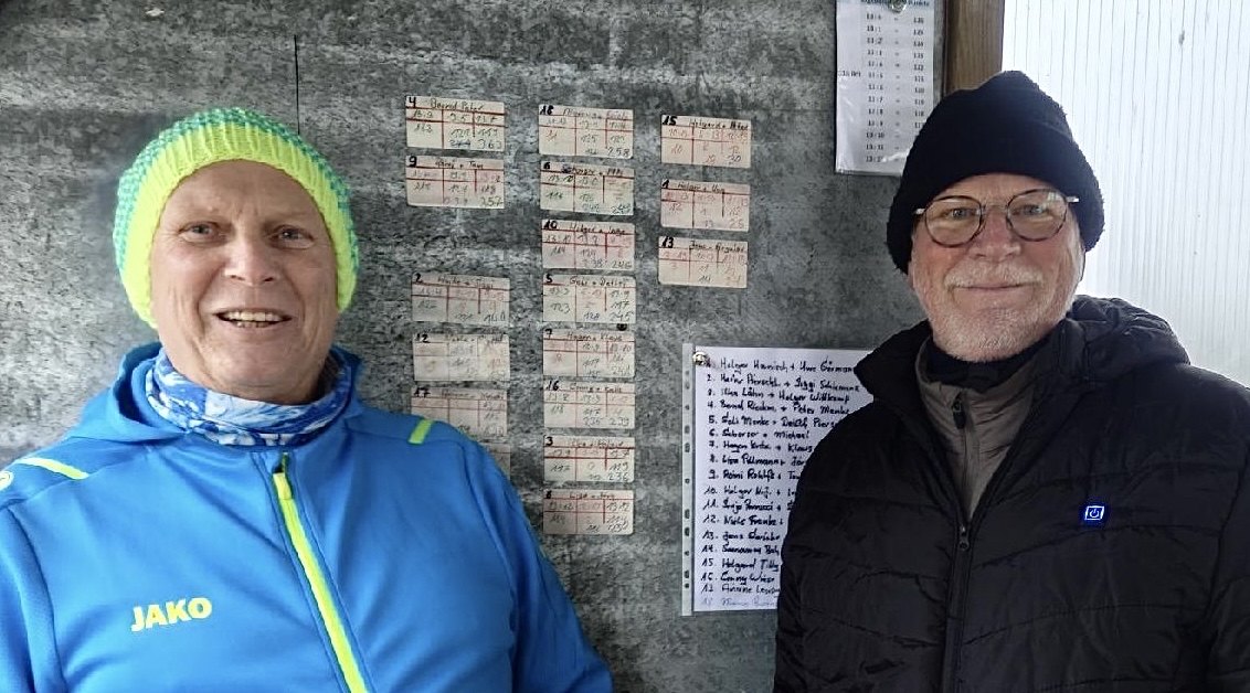Peter Menke und Bernd Rieckmann vom B-Team Rettmer (Foto unten) haben am SA 17.01. den vierten AAle-Cup gewonnen, den FLB Hohnstorf wieder zugunsten von „Ärzte ohne Grenzen“ organisiert. Auch auf drei Siege kamen Romi Rohlfs und Tom Westphal (Rettmer). Am Start waren alle 18 gemeldeten Duos. An der Spitze der Gesamtwertung, die 64 Namen auflistet, stehen die Lokalmatadoren Erich Kind und Marcus Prochnow. Die Hohnstorfer hatten ihre Anlage am Elbe-Deich von allen Winterspuren befreit und fürs leibliche Wohl der Aktiven gesorgt.