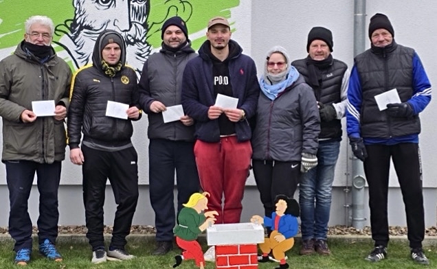 Wieder einmal startete das Boule-Jahr in Wiedensahl, wo die Busch-Bouler am Neujahrsmorgen 56 Aktive zum ersten ihrer Sieben Streiche begrüßen konnten. Nach drei Runden Super-mêlée erhielt Tagessieger Wolfgang Herrmann (+31) aus Petershagen zusätzlich zum Preisgeld eine dicke Mettwurst. Auch auf drei Siege kamen Ralph Schüler (+25), Neu-Busch-Bouler Oliver von Alten (+24), Martin Becker (+23), Thomas Bergmann (+22), Helmut Diekmann (+21), Mirko Nerge (+16), Andre Knopp (+16), Birgit Schüler (+15), Norbert Haverland (+13) und Doris Nerge (+12). Kaffee, Glühwein und Gulaschsuppe halfen, das fröstelige Wetter zu ertragen. Der 2. Streich folgt am SO 11.01., dann schon ab 10 Uhr.