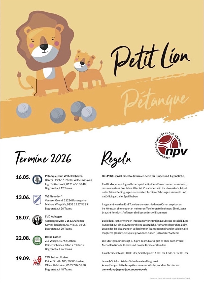 Jan-Philipp Krug mit Noah Meyer und Leon Jentsch sowie Frank Günther mit Daniel Rathe und Nils Schön: Diese beiden Trios vertreten Niedersachsen beim großen NRW-Kaderturnier am SA 31.01. in der Düsseldorfer Boulehalle. Neben je zwei Teams aus Bayern, Rheinland-Pfalz und Hessen hat der veranstaltende Landesverband 16 eigene Teams eingeladen – in den Kategorien Damen (3), Herren (4), Espoirs (1), Jugend (1), Veteranen (3) und „WildCard“ (4). Für die 55plus-Teams ist es die letzte Vorbereitung auf den Länderpokal am 28.02./01.03. in Gersweiler. Prominente Aktive, die auf der TN-Liste » fehlen, sind Anna Bohnhoff und Carolin Niermann bei den Frauen sowie Marco Lonken, Moritz Rosik, Philipp Niermann und Tom Wierzoch bei den Männern; die Gründe dafür sind hier nicht bekannt.