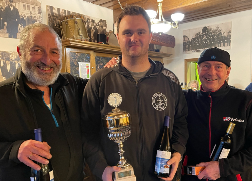 der Erinnnerung an Rolf Wallrabe stand der 2. WinterTreff, zu dem am SA 22.11. über 30 Boulisten beim Schwaneweder Schützenverein erschienen waren. Wallrabe, der die Boule-Anlage dort aus eigenen Mitteln anlegen ließ, war im Juli 2025 verstorben. Nach drei Runden Super-Mêlée durften Michael Mertens, Bruno Dietze (beide Tura HB) und Uwe Bargmann (PC Oldenburg) ihre kleinen Preisgeld-Umschläge präsentieren. (Quelle: Uwe Bargmann, 22.11.2025.)