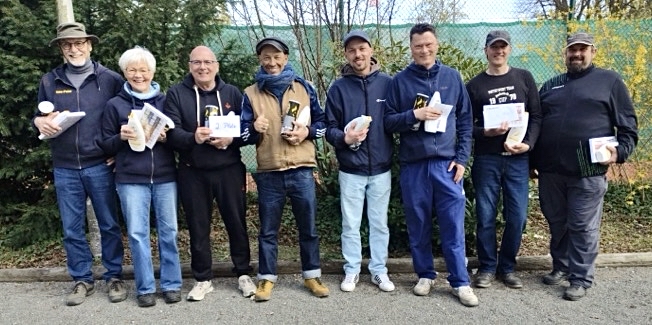 Hauptgewinner der Winterserie von FLB Hohnstorf war – wie in den Vorjahren – „Ärzte ohne Grenzen“. Für die Hilfsorganisation spendeten 73 Teilnehmer im Lauf der sechs Doublette-Turniere insgesamt 1.265 EUR, noch einmal deutlich mehr als zuletzt. Zum Abschluss am SA 21.03. belegten Carsten Jaeger und Thomas Pahl unter 22 Teams den obersten Stockerlplatz vor den ebenfalls unbesiegten Romi Rohlfs und Edgar Zwicke sowie den Lokalmatadoren Schorser Schamann und Michael Meyer. Letzterer präsentierte auf dem Foto die Sieger der Gesamtwertung, namentlich Heike Pierschewicz (mit dem Spendenscheck) und Siggi Schiemenz, beide vom B-Team Rettmer