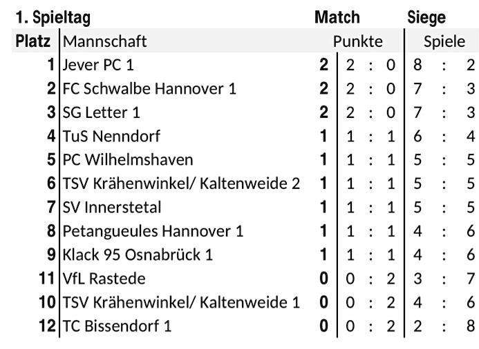 SG Allez Allee 1 – SV Innerstetal > 12:6 (126:98)