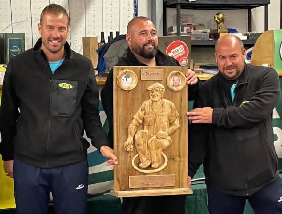 Das Siegertrio präsentierte die Erinnerungstafel „Souvenir Robert Vial“. Der 2022 mit 95 Jahren verstorbene Vial zählt zu den Gründervätern von Nyons Pétanque.