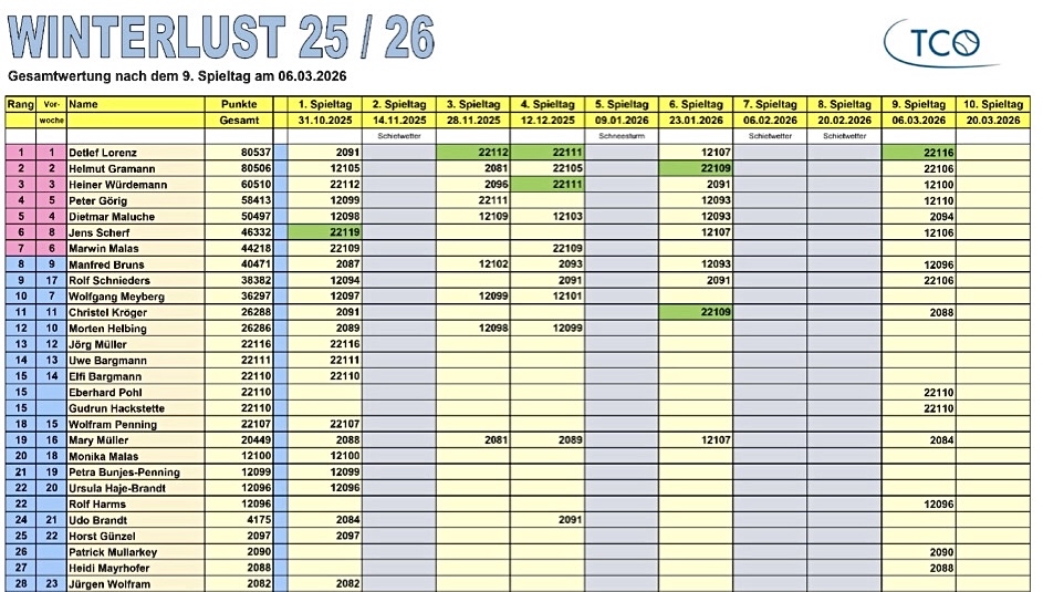 Den vorletzten Tagessieg beim Winterlust-Super-Mêlée des TC Oldenburg-Süd sicherte sich am FR 06.03. Lokalmarador Detlef Lorenz, der auch die Gesamtwertung » anführt. (Quelle: Helmut Gramann, 08.03.)
