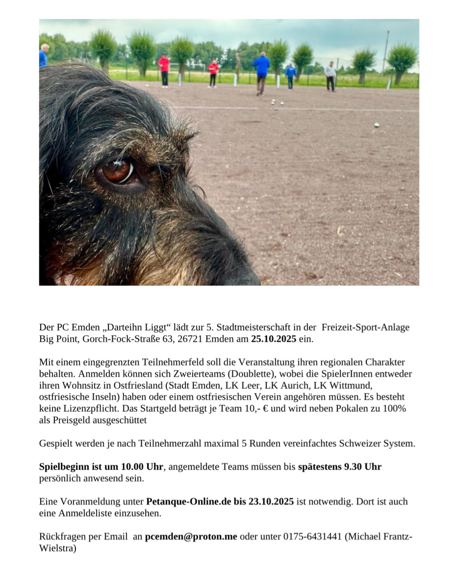 Drittens. - Am SA 11.10. ist SVN Düshorn von 11 bis 17 Uhr Gastgeber eines Jugendtrainings „für alle von 6 bis 22 Jahren“. Anmeldung unter jugend@petanque.de »