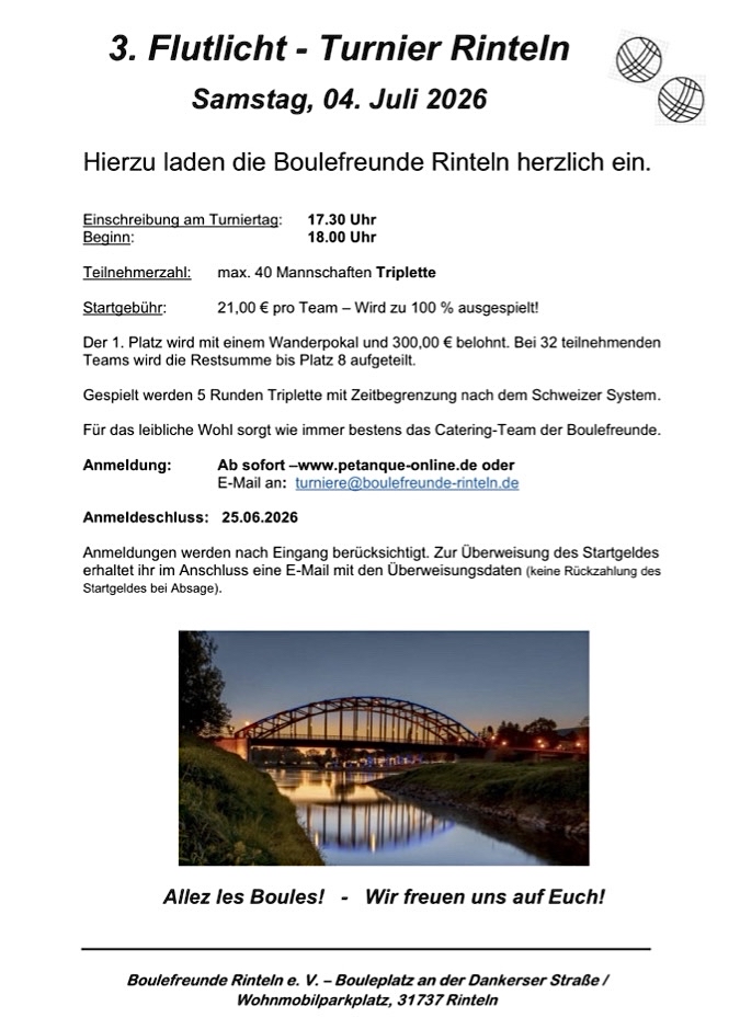 Wer sich auf „petanque-online.de“ für eins der beiden Holstentorturniere oder für das Esseler Turnier-Wochenende (Allertal 22, Leinetal 3:3) eingeschrieben hat, bekommt zwar per E-Mail eine Bestätigung, kann aber nicht sehen, wie viele Teams sonst schon gemeldet sind geschweige denn, welche Spieler:innen auf der Liste stehen. Ursache: Die Veranstalter, also CdB Lübeck und SV Essel, haben die Meldeprozedur so eingerichtet, dass die namentliche Meldeliste erst nach manueller Bestätigung der einzelnen Teams angezeigt wird. Ob und ggf. wann das noch geändert werden soll, ist hier nicht bekannt.