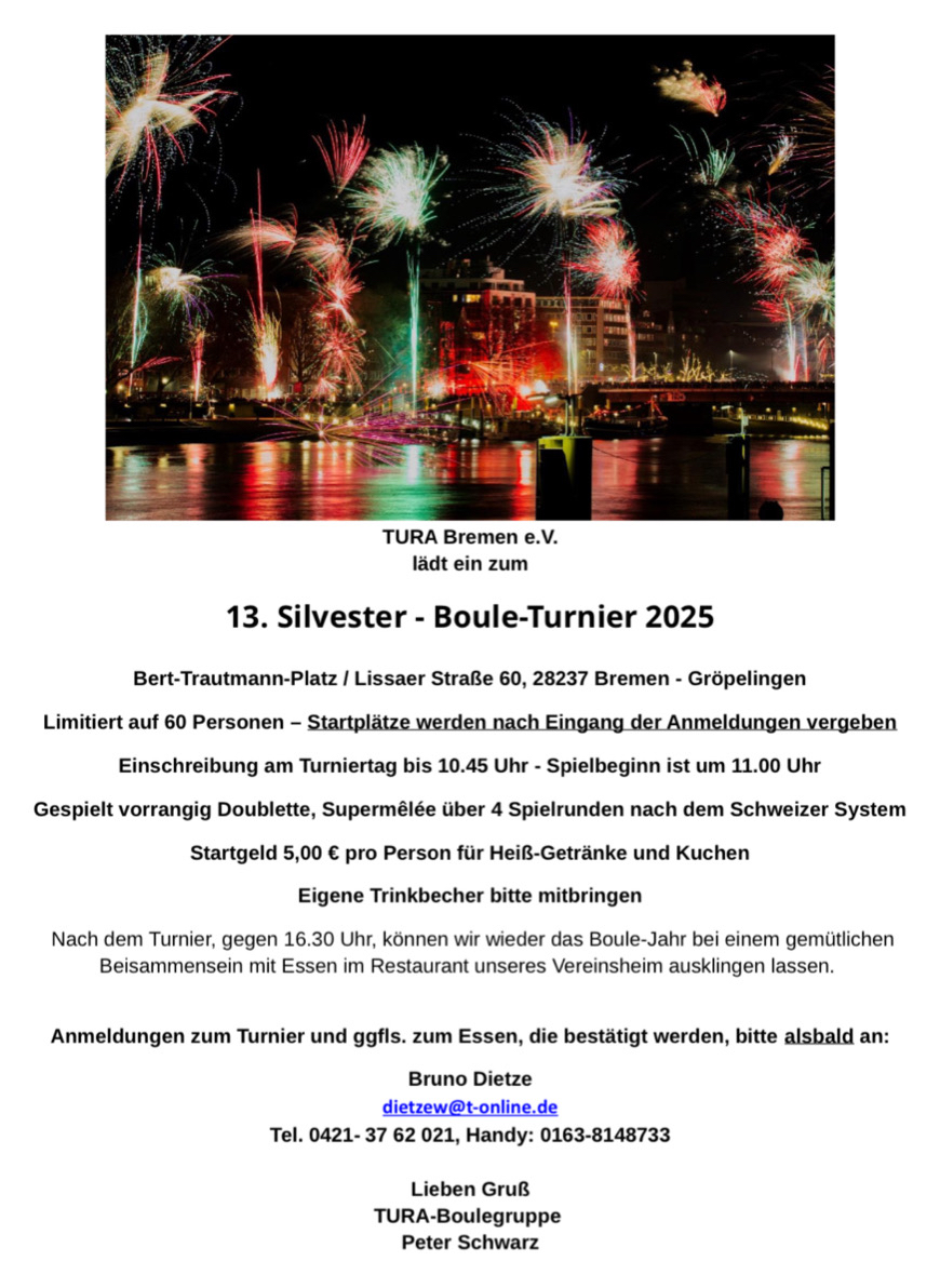 Am 9. Dezember 1995 gegründet, feierte der „Wilde Boule“ PC Wildeshausen am SA 29.11. sein 30-jähriges Bestehen mit einem Einladungs-Super-Mêlée, zu dem Vereins-Chef Hans-Georg Kolloge knapp 60 Teilnehmer:innen begrüßen konnte.