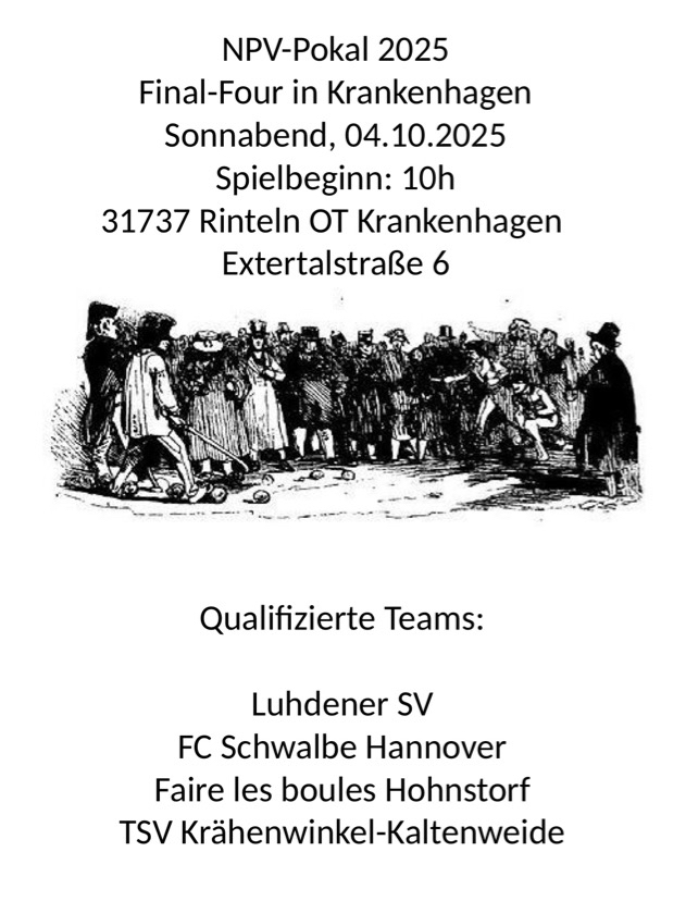 Bisher gelang es nur der SG Allez Allee Hannover, die Siegesserie des TSV Krähenwinkel-Kaltenweide im 2020 erstmals ausgetragenen NPV-Pokal zu unterbrechen. Das war 2021. In diesem Jahr wollen sich FC Schwalbe Hannover, Luhdener SV und FLB Hohnstorf gegen die „Krähen“-Dominanz behaupten. Ob es gelingt, entscheidet sich am SA 04.10. beim Final Four in Rinteln. Auf dem YouTube-Kanal » von „boule4you“ sollen einzelne Partien live zu sehen sein.