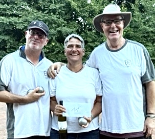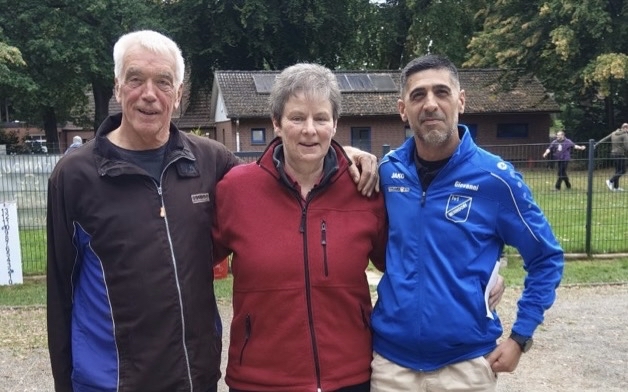 Hans-Hermann König, Nicole Foth und Giovanni Branca (unten v.l.) haben am SA 27.09. das 7. Rosengartenturnier gewonnen. Im Finale setzte sich das Trio vom gastgebenden TuS Nenndorf mit 13:2 gegen Moritz Falk, Mathis Froese und Mihaja Rajanoro von Elbe Pétanque durch. Beide Teams waren ohne Niederlage durch die vier Turnierrunden marschiert. Platz 3 sicherten sich Paul Franke, Jörg Palm und Hergen Tuna, ebenfalls von Elbe Pétanque (LV Nord). Von 32 gemeldeten Teams war eines nicht erschienen.