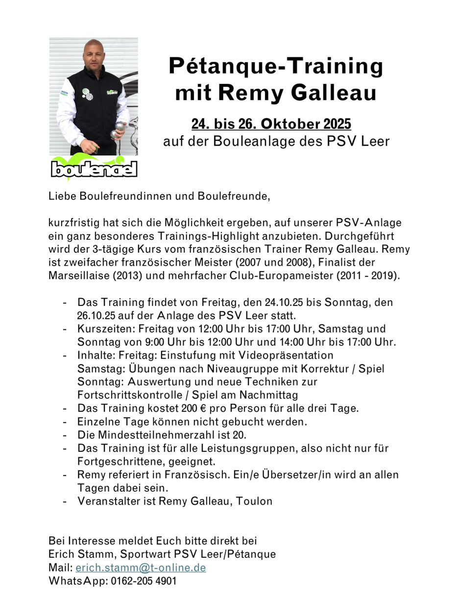 24. bis 26. Oktober – an diesen drei Tagen leitet der frühere frz. Spitzenspieler Remy Galleau auf der Anlage des PSV Leer ein Pétanque-Training. Details » (23.09.)