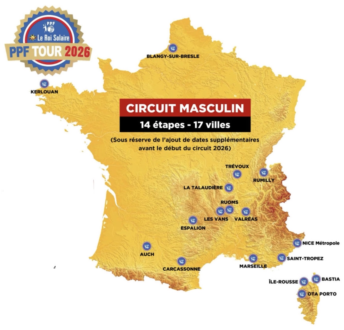 Eine erkennbar südfranzösische Schlagseite haben die Orte, die an 14 Wochenenden jene 17 Turniere ausrichten, die zur PPF-Tour 2026 gehören. Den Anfang macht Ende Mai Les Vans in der Ardèche. Folgen unter anderem mit Bastia (Aug.) und Île Rousse (Sept.) zwei Turniere auf Korsika. Wie zuletzt werden die letzten Punkte wieder in Saint-Tropez vergeben (30.11./01.12.).