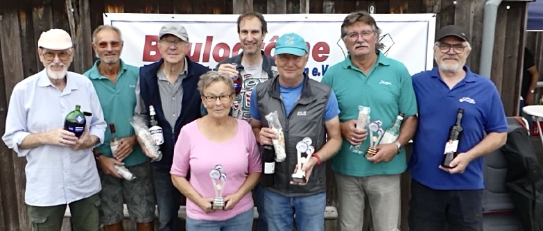 Hans-Hermann König, Nicole Foth und Giovanni Branca (unten v.l.) haben am SA 27.09. das 7. Rosengartenturnier gewonnen. Im Finale setzte sich das Trio vom gastgebenden TuS Nenndorf mit 13:2 gegen Moritz Falk, Mathis Froese und Mihaja Rajanoro von Elbe Pétanque durch. Beide Teams waren ohne Niederlage durch die vier Turnierrunden marschiert. Platz 3 sicherten sich Paul Franke, Jörg Palm und Hergen Tuna, ebenfalls von Elbe Pétanque (LV Nord). Von 32 gemeldeten Teams war eines nicht erschienen.