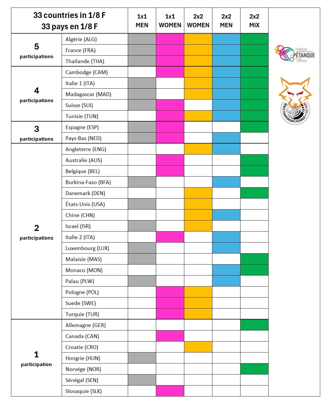 LÜCKE. Das westafrkanische Benin, zuletzt noch WM-Gastgeber und Titelverteidiger im Mixte, fehlt in Rom. Angeblicher Grund: Verspätet eingereichte Dokumente hätten die Ausreise der weiblichen Team-Hälfte verhindert. Laut FIPJP-Reglement dürfen nur komplette Teams (2m+2w) teilnehmen.