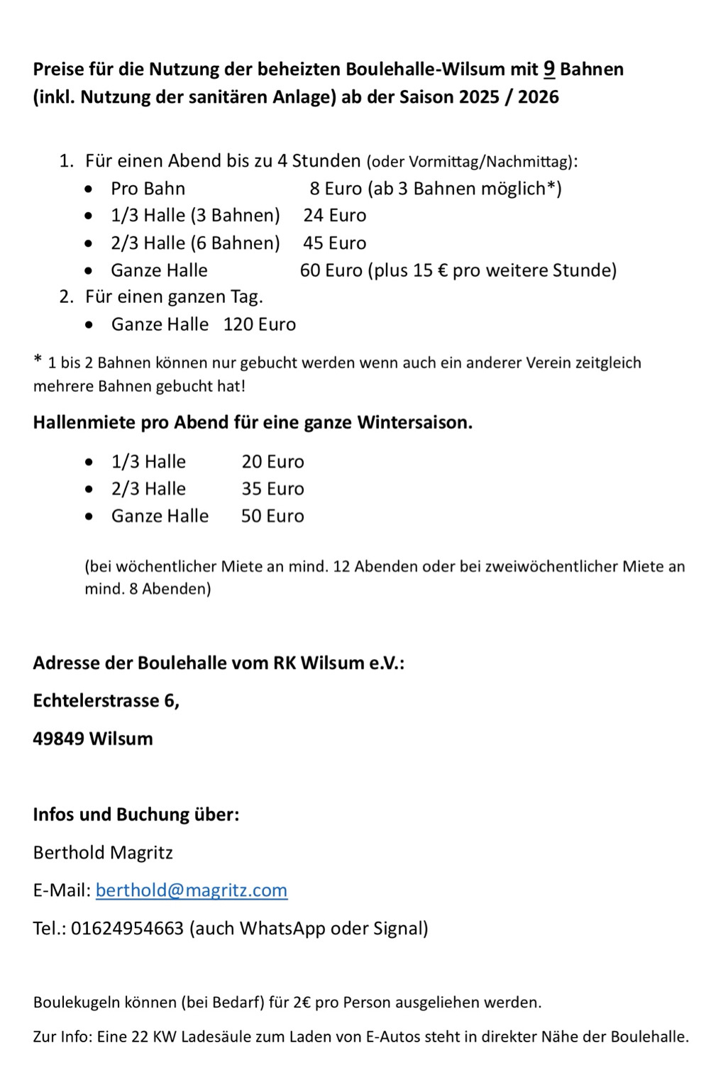 Der RK Wilsum vermietet seine 9-Felder-Halle auch im kommenden Winter. Neu ist, dass drei oder sechs Felder gebucht werden können. Siehe Preisliste » Details erklärt Berthold Magritz unter Tel. 0162 4954663. (Quelle: B. Magritz, 29.09.)